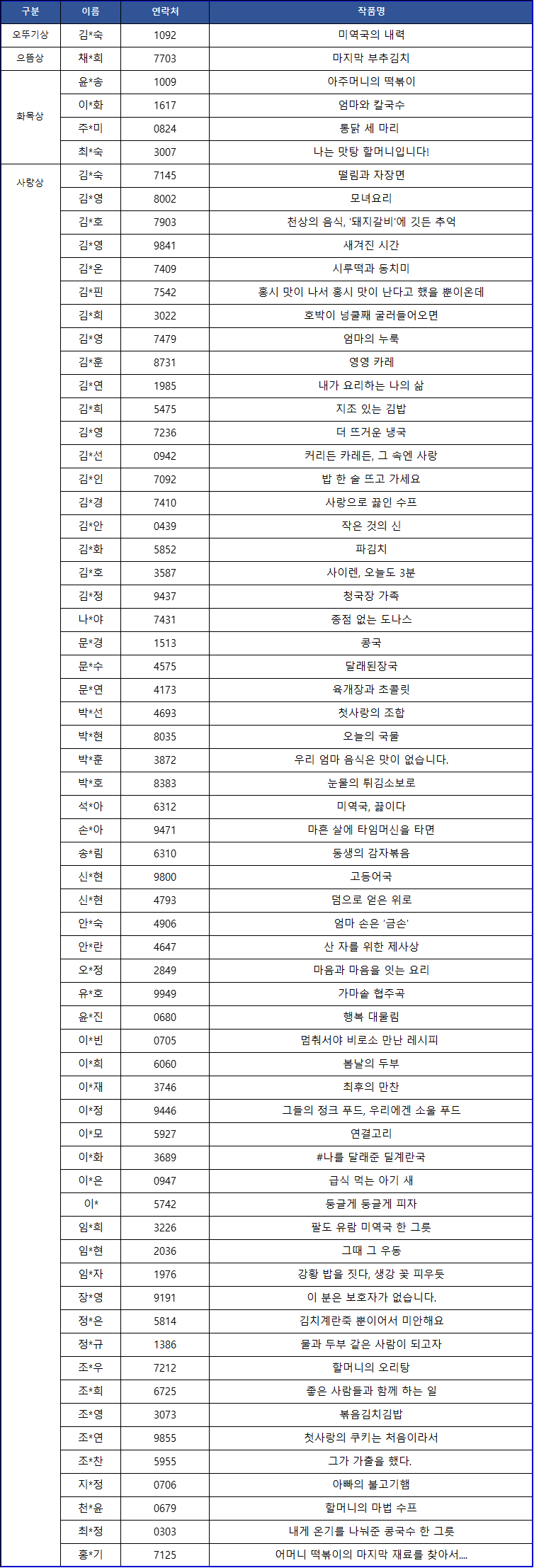 가족, 그리고 사랑하는 사람과 함께한 이야기가 음식과 버무려지면서 따뜻함과 감동을 주는 많은 작품들이 응모되었습니다.