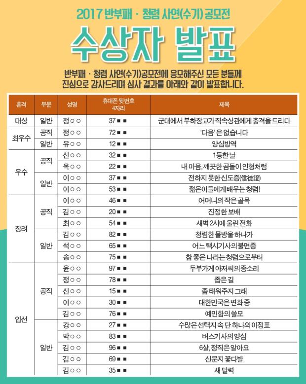2017 반부패·청렴 사연(수기) 공모전 수상자 발표
